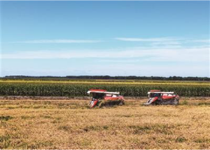 我市目前农作物耕种收综合机械化率高达96%。图为早稻机械化收割场景。
