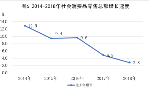 全年实现社会消费品零售额比上年增长2.8%。按销售单位所在地划分:城镇消费品零售额同比增长3.3%,其中城区消费品零售额同比增长4.5%;乡村消费品零售额同比增长0.4%。按消费形态统计,商品零售额同比增长2.7%;餐饮收入额同比增长3.8%。