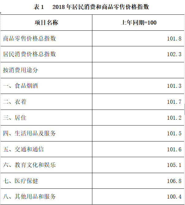 全年全市居民消费价格指数为102.3%。其中:食品烟酒类上涨1.3%;居住类上涨1.2%;生活用品及服务类上涨1.5%;医疗保健类上涨6.8%;衣着类上涨1.7%;教育文化和娱乐类上涨5.1%;交通和通信类上涨1.6%;其他用品和服务类上涨0.4%。